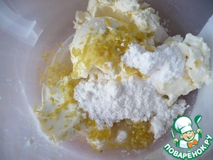 Тем временем приготовим крем чиз: берем сливочный сыр, добавляем лимонную цедру, лимонный сок, ванильный сироп и сахарную пудру.