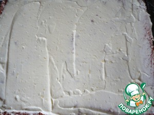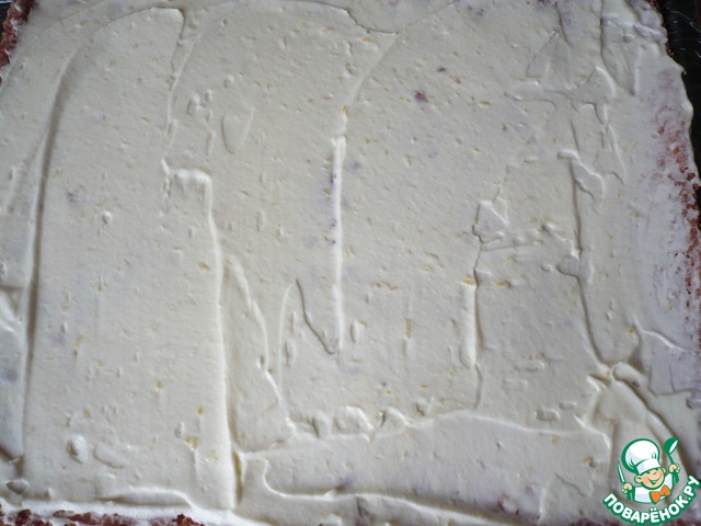 Бисквит хорошо остыл, а крем охладился (он должен загустеть). Аккуратно разворачиваем полотенце (при необходимости можно помогать лопаткой или ножом), бисквит получился нежный, влажный - будьте аккуратны и не торопитесь! Когда развернете бисквит, затем снова сверните его, так легче можно перенести рулет на пищевую пленку. Затем снова разверните рулет и обрежьте края бисквита по короткой стороне. Нанесите на бисквит охлажденный крем, тщательно распределяя его по всей поверхности.