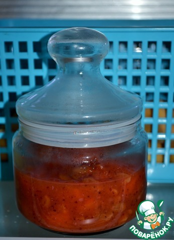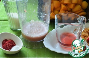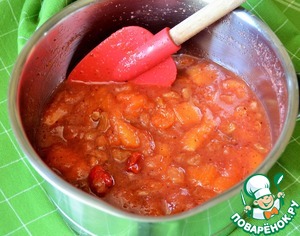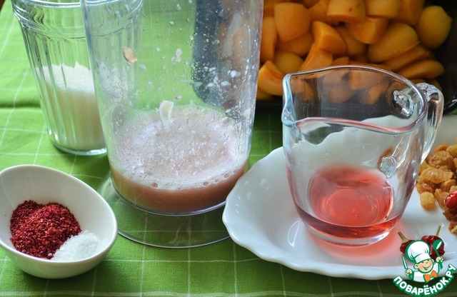 Абрикосы переложить в сотейник ( с толстым дном) + чесночно-имбирную смесь, влить оставшийся уксус, добавить соль и сахар, перец.
