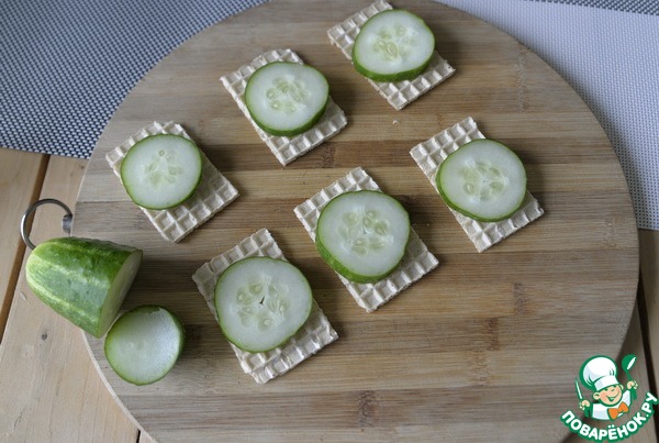 Огурец режем тонкими шайбами, кладём сверху хлебцов.