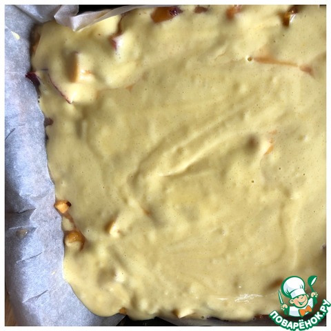 Добавить разрыхлитель и муку, взбить минуту. В форму (26 см) выложить половину теста. Сверху нарезанные маленьким кубиком нектарины и абрикосы.
