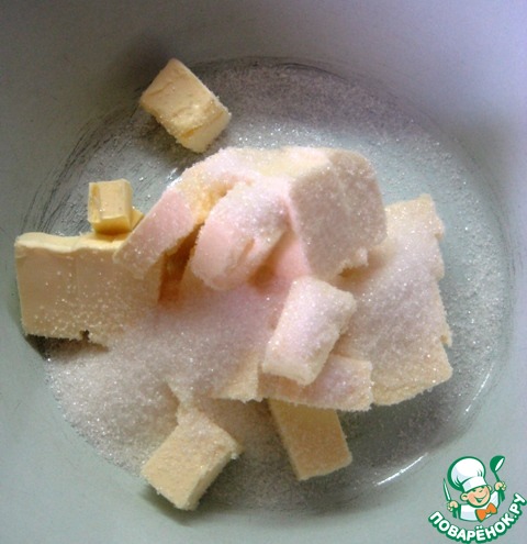 в миске соединить кусочки холодного сливочного масла и сахар. -