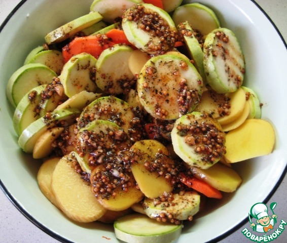 Благодатная пора свежих, молодых овощей! Предлагаю попробовать запеченные в духовке молодой картофель, морковь и кабачки в ароматной заправке с французской горчицей и чесноком!