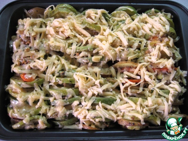 • Затем форму с овощами вынимаем из духовки, аккуратно снимаем фольгу и присыпаем верх натертым сыром. Снова отправляем в духовку на 5-7 минут до расплавления сыра и легкой золотистой корочки. Вынимаем из духовки и присыпаем измельченной зеленью.