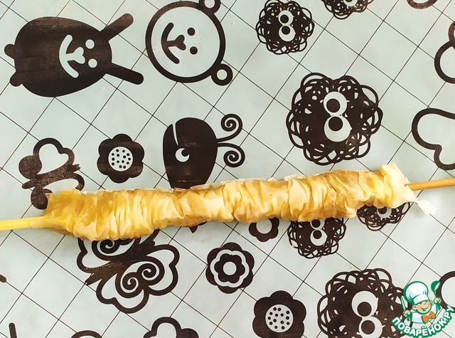 • При помощи палочки свернуть тесто с начинкой в рулет, не вынимая палочку.