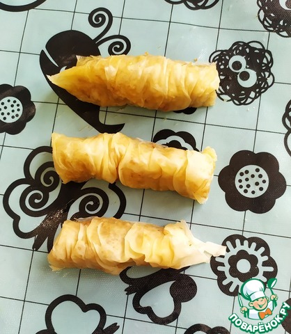 • Тесто "Фило" перед использованием обязательно разморозить. Оно должно оттаять постепенно. Аккуратно развернуть упаковку с тестом, немного пригладить листы, чтобы они приняли ровную поверхность. Взять 1 лист. Смазать растопленным сливочным маслом. Остальные листы накрыть полотенцем, чтобы они не высохли.