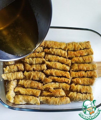 • Вынуть из духовки. Оставить пахлаву остывать. От сиропа она станет мягче и сочней. Украсить по желанию.