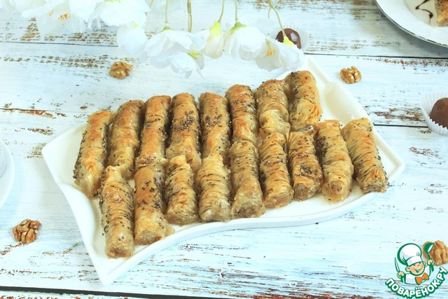 Готовила всё по рецепту, но сверху ещё и щедро посыпала орехами, резала не трубочками, а квадратиками, но это не отразилось на вкусе.