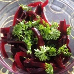 Для себя я сделаю лёгкий салатик. Выложу брусочки свёклы на тарелку, порублю зелень: укроп и петрушку, добавлю оливки и заправлю оливковым маслом. Можно капнуть немного бальзамика.