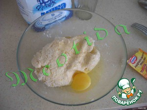 высыпаем муку, разрыхлитель и вымешиваем нежное, не липнущее к рукам тесто
