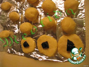 теперь каждый шарик надо расплюснуть и внутрь прячем кусочек чернослива (или орешка, или кураги, или цуката, на Ваш вкус..а можно в каждый шарик разную начинку положить) и скатываем опять в шарики с сюрпризом внутри