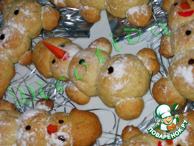 зима - это отличное время для детских забав.. и когда на улицах лежит ковер из сверкающего снега, то все детишки с радостью лепят снеговиков, а что делать если снега на улице совсем нет? - ЛЕПИТЬ СНЕГОВИКОВ ДОМА!... снеговиков на закуску и салатик поварята уже слепили.. самое время для сладких снеговичков! а Ваши малыши с удовольствием помогут Вам лепить наших очаровашек.. нежное песочное тесто с корицей, мускатным орехом, ванилинчиком и кокосовой стружкой.. с сюрпризом внутри..