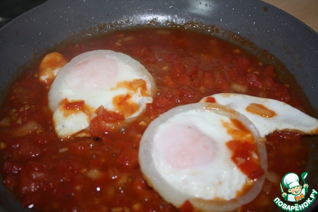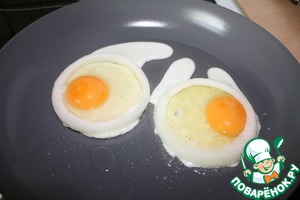 Итак... Разогреть масло выложить луковые кольца и аккуратно разбить яйца в них. Чуть присолить и запекать под крышкой около 3х минут.