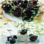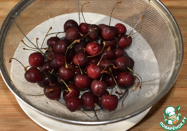 Берём черешню с хвостиками, так более эффектно. Кладём в дуршлаг, промываем. Даём стечь.