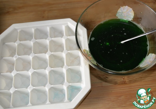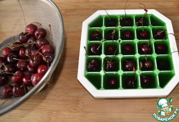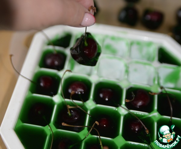 Равномерно заливаем форму остывшим мятным раствором с желатином. Кладём в каждую ячейку по ягоде черешни хвостиком вверх.