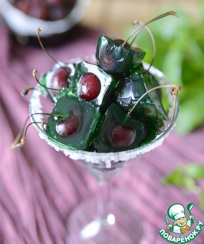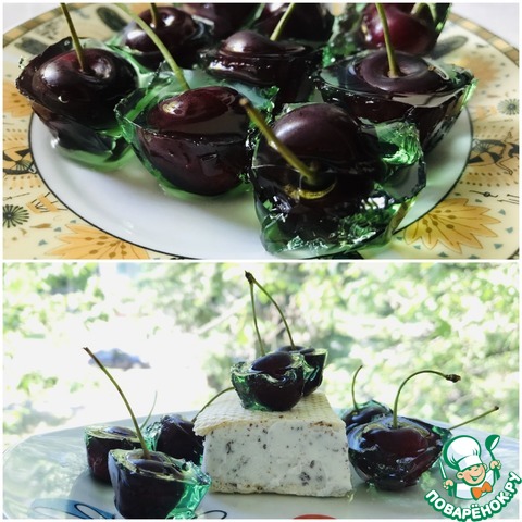Перед подачей достаём форму с желе из холодильника. Даём немного постоять при комнатной температуре и аккуратно за хвостик вынимаем желе с черешней.