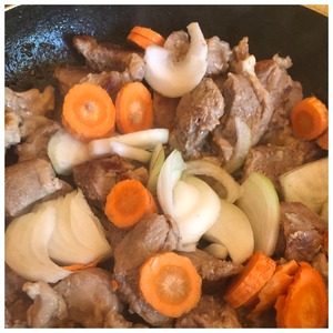 Лук нарезать полукольцами, морковь - кружочками. Выложить к мясу, влить 300 мл кипяченой воды. Огонь убрать на минимум, закрыть крышкой и тушить 30 минут.