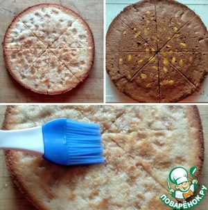 Каждый корж разрезать на 8 равных частей. С помощью силиконовой кисточки обильно пропитать ананасовым сиропом каждый корж с двух сторон. Если корочка у коржей получилась плотная, не пористая, то её можно срезать, чтобы лучше пропитались коржи. Сироп можно использовать любой другой, на ваш вкус. Все коржи у меня получились, примерно, одной высоты кроме морковного. Он получился чуть больше, поэтому я срезала верхушку, сравняв его с остальными коржами.