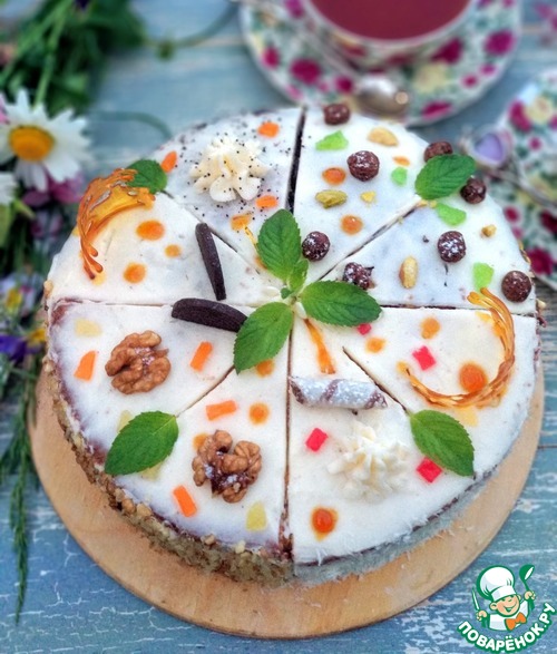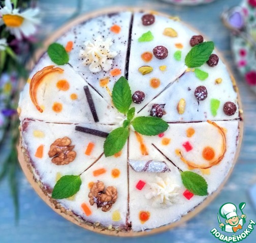 Украсить по желанию. Бока маковых кусочков я обсыпала маком, бока шоколадных кусочков - измельчёнными фисташками, бока морковных кусочков - измельчёнными грецкими орешками, бока кокосово-ананасовых кусочков - кокосовой стружкой. Затем убрать в холодильник минимум на 2 часа. Перед подачей сверху я украсила торт карамелью, маком, шоколадными шариками, орешками, шоколадкой, вафельной трубочкой, цукатами и листиками мяты.