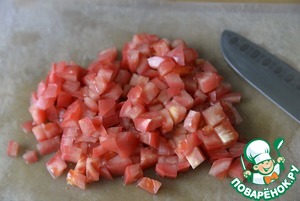 Помидоры режем кубиками и откидываем на сито, чтобы стекла лишняя жидкость.
