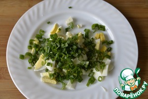 Добавляем к яйцам рубленный зелёный лук, соль (не пересолите!!!), перемешиваем.