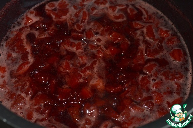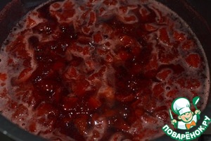 Компот: нарезанную на кусочки клубнику с сахаром и соком довести до кипения.