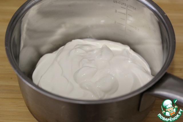 Сметану выложить в небольшую кастрюлю с толстым дном и поставить на огонь.