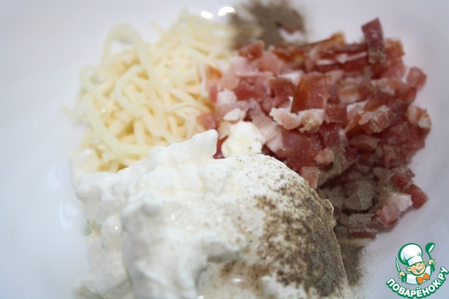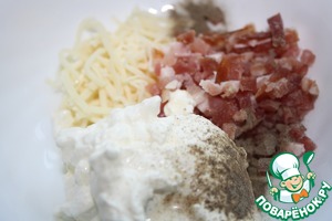 Смешать сыр, мелко нарезаный бекон, сметану.
