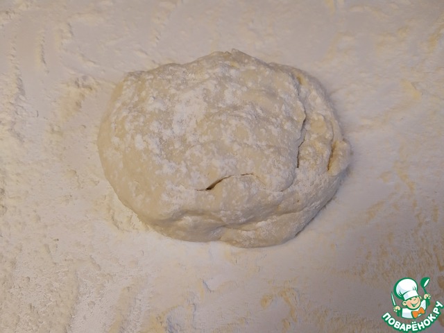 В муку добавим соль, воду и замесим тесто. Оно должно получиться достаточно липким.