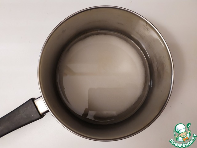 В воду положим сахар, поставим на огонь и помешивая доведём до 100 градусов. К этому моменту сахар полностью растворится и сироп начнёт кипеть. Снимем с огня.