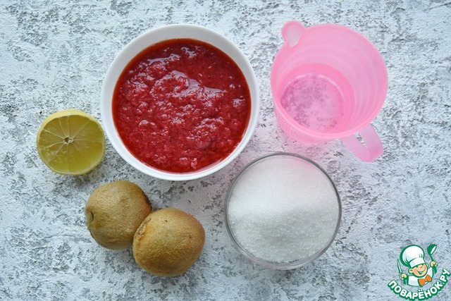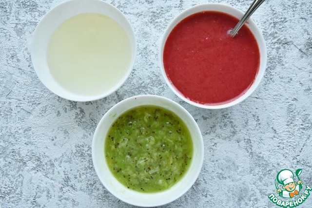 • Из половинки лимона выжать сок, смешать его с водой, всыпать 2 ст. л. без горки сахара и размешать до полного его растворения. Клубнику размять или измельчить блендером вместе с 2 ст. л сахара. Приготовить пюре из киви и смешать его с оставшимся сахаром.