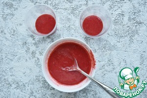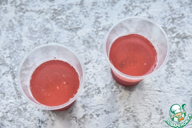 • Подготовить две формочки или одноразовые пластиковые стаканы. На дно форм выложить клубничное пюре и поставить в морозильную камеру на два часа.