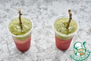 • Последним слоев выложить пюре из киви. В середину формы установить палочки и отправить фруктовый лед в морозильную камеру до полного его замораживания.