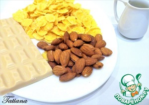 Измельчите кукурузные хлопья и миндаль (по отдельности), смешайте с растопленным шоколадом.