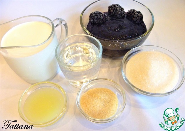 В ежевичное пюре добавьте сахар и лимонный сок. В воде замочите желатин. Набухший желатин распустите (микроволновка 60% = 1 мин.), вмешайте в ежевичное пюре. Сливки взбейте в стойкую пену, смешайте в ежевичным пюре. Получившийся крем выложите в кулинарный мешок, уберите в холодильник до небольшого загустения.