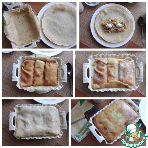 Блинный пирог с жареной капустой с луком, курицей и перепелиными яйцами, запечённый в сливках с яйцами.