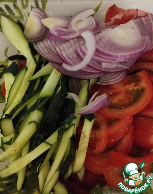 Для начала подготовим все овощи. Помидор и лук режем полукольцами, огурец небольшими брусочками.