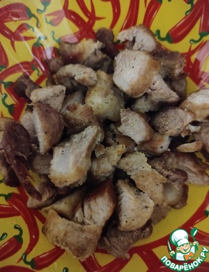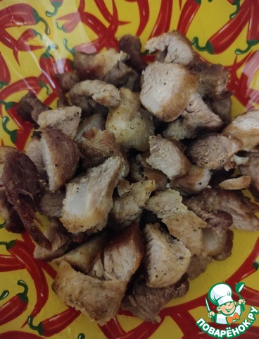 Мясо предварительно обжарить и нарезать небольшими кусочками.