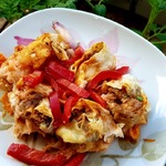 Перец сладкий режем соломкой, обжариваем немного на растительном масле -