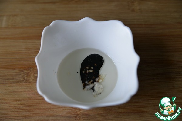 Начинаем с приготовления заправки. Смешиваем масло, уксус (можете заменить на сок лимона), соевый соус, выдавливаем чеснок.