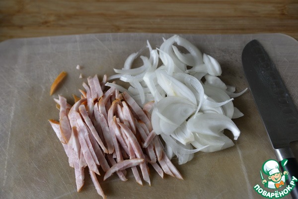 Берём колбасу, у меня свиная полукопчёная, режем тонкой соломкой, лук режем перьями.