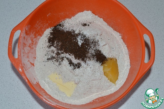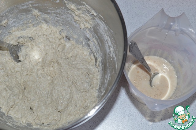 В отдельной миске смешать с оставшейся водой 150 гр пшеничной муки и 60 гр ржаной.