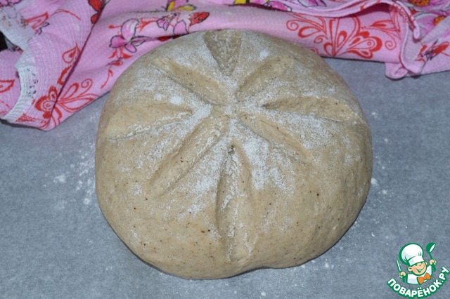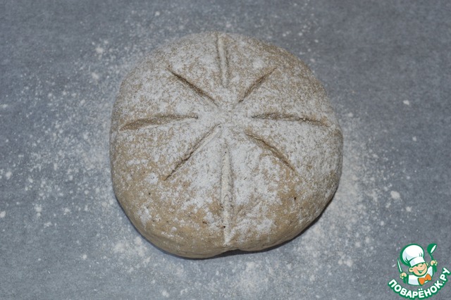 Выложить на противень, сделать острым ножом надрезы и присыпать мукой.