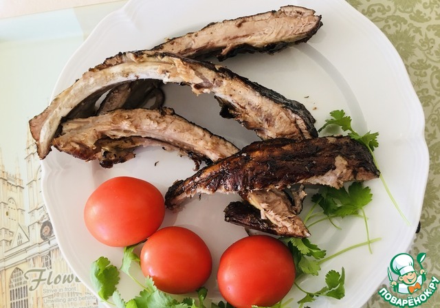 Вот такие свиные рёбра из духовки. Ребра не сгорели, это соус их подкрасил в коричневый цвет. У меня соя соус с мёдом.
