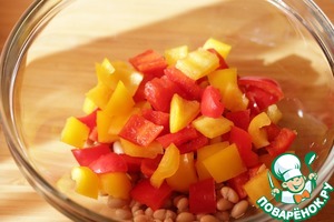 Добавить сладкий перец, нарезанный на небольшие квадратики.