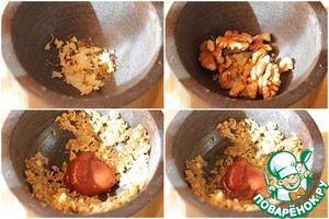 В ступку выложить соль (лучше крупную), хмели-сунели, тертый чеснок. Добавить грецкие орехи и хорошо растереть пестиком.
