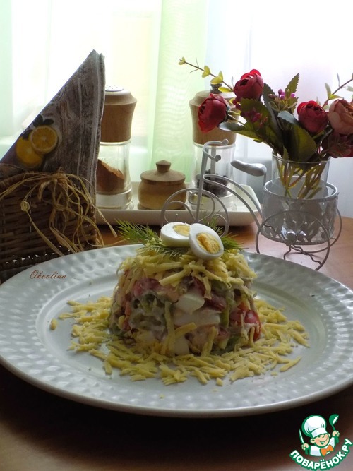 Для подачи я салат выложу в одно общее блюдо. Чтобы он красиво смотрелся на столе, я подберу для него посуду красивой формы и размером, чтобы салат заподлицо поместился в неё. Можно конечно воспользоваться кольцом, но оно у меня размером небольшое - на одну порцию. Я взяла небольшой салатник, проложила его пищевой плёнкой. Выложила салат в него уплотняя. Натёрла сыр на средней тёрке. Выложила сыр наверх. Перевернув салат, сыр у меня будет нижним слоем. Его не промазываем заправкой. Подворачиваем края плёнки, накрывая салат и ставим в холодильник минут на 15-20, чтобы форма перевёрнутого салата на тарелку закрепилась и не развалилась и все ингредиенты в салате пропитаются заправкой.