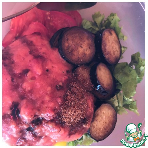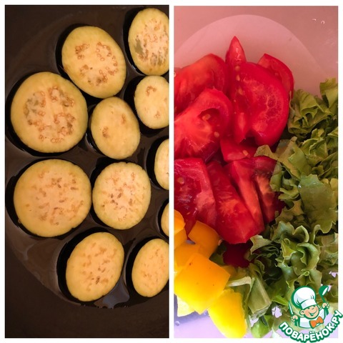 Баклажан нарезать кружочками и обжарить в растительном масле с двух сторон. Выложить на бумажные салфетки, чтобы стекло лишнее масло. В салатник нарезать 1 крупный помидор дольками, листья салата нарезать произвольно. Болгарский перец 0.5 шт нарезать средним кубиком.