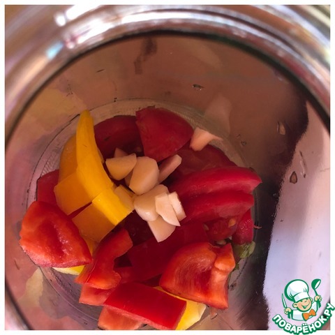 В чашу блендера выложить чеснок, листочки базилика. Помидор и оставшийся перец нарезать произвольно и все пробить блендером до однородной массы.