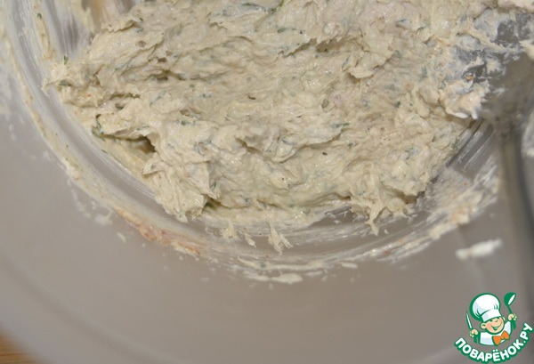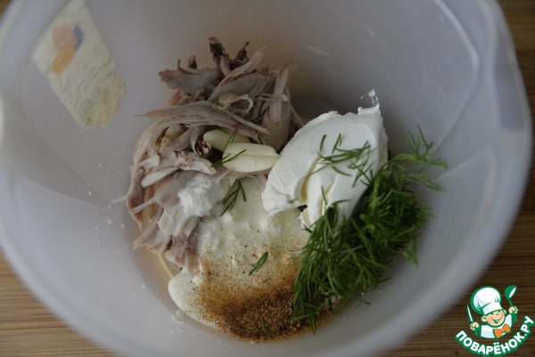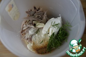 Соединяем вареное куриное филе (у меня от бёдер), творожный сыр, сливки, чеснок, укроп, соль и смесь перцев молотую.